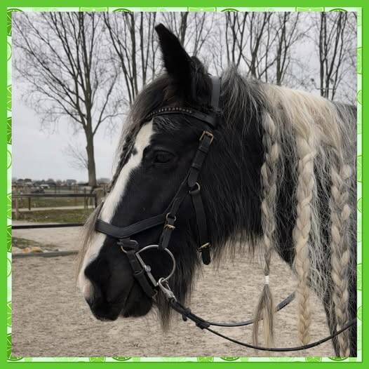 Cellie, een robuuste Tinker loopt graag scheef/ met de hals gebogen naar links of rechts om wat onder de ruiterhulpen uit te komen. Met de D trens blijft het bit recht in de mond én je krijgt wat stuurhulp aan de buitenkant.